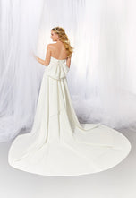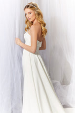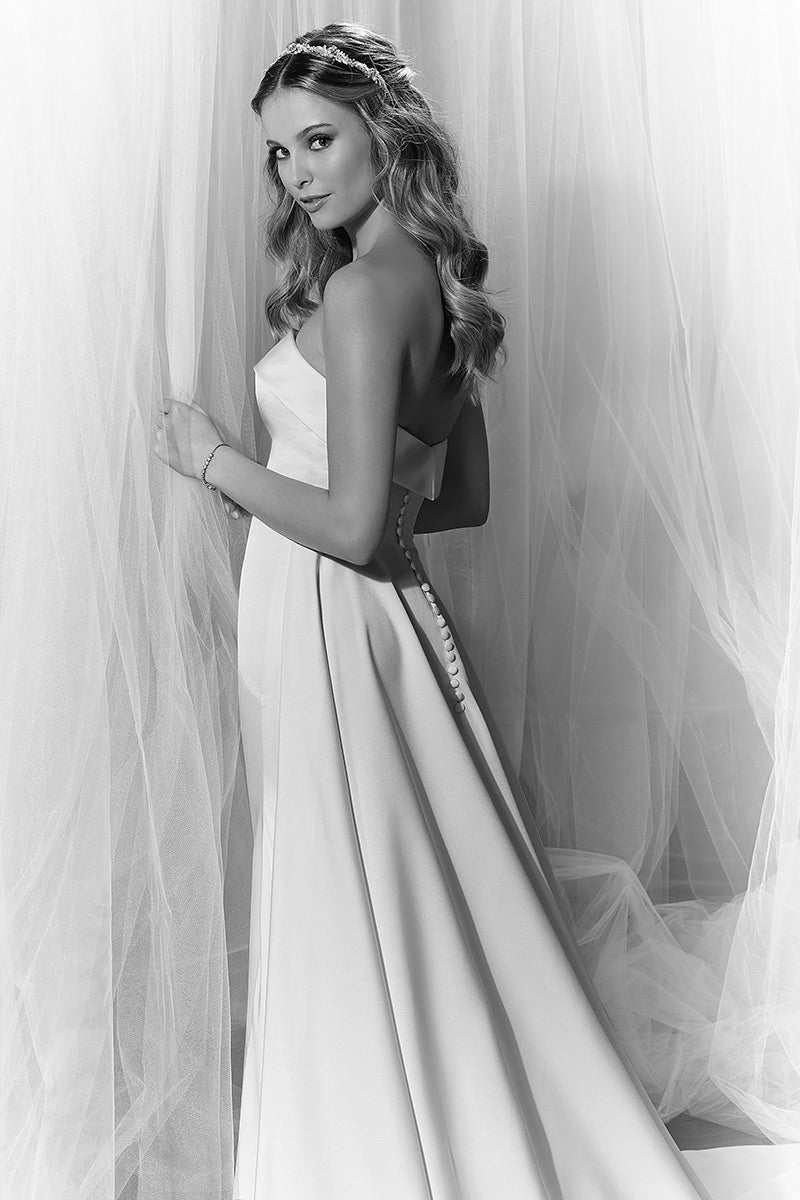 The Ava designer wedding dress is all about classic, clean lines. Featuring a sophisticated strapless neckline and Larissa Satin fit and flare silhouette. Covered buttons and a romantic detachable back bow trim the back and complete the chic look. Styled with Headpiece HP4069. Shown in Ivory.