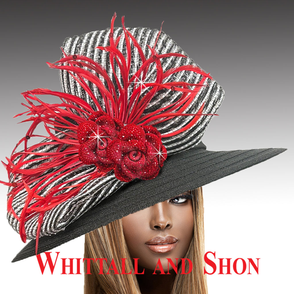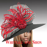 “Bourbon”—a showstopping Derby hat that blends classic elegance with bold flair. Its 4.5” brim and flat crown create a structured silhouette, while a generous striped bow adds a playful touch. At the center of the design, lies a sparkling crystal-encrusted flower and a dramatic fireworks spray of feathers, adding a celebratory charm. Perfect for making a statement at the Derby or any grand occasion!