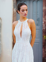 Behold Autumn, a Wilderly by Allure F167 masterpiece where romance meets bohemian whispers. Its bodice, a tapestry of intricate lace, dances with sunlight, revealing hints of skin through unique keyhole openings. The high neck, framed by delicate cap straps, adds a touch of vintage elegance, while the low open back, secured with covered buttons, whispers secrets of modern allure. Imagine swirling across the dance floor, the A-line silhouette cascading around you like autumn leaves in a breeze. The chapel train, a scalloped symphony of lace, trails behind, leaving a trail of enchantment in its wake. This is a dress that speaks of moonlit meadows and stolen kisses, of whispered promises and dreams coming true. Autumn's beauty isn't just skin-deep, it's woven into the very fabric of her being. The exquisite lace, a testament to the artistry of Wilderly, shimmers with every movement, catching the light like dewdrops on spiderwebs. It's a whisper of nature's magic, a promise of forever etched in thread and silk.
