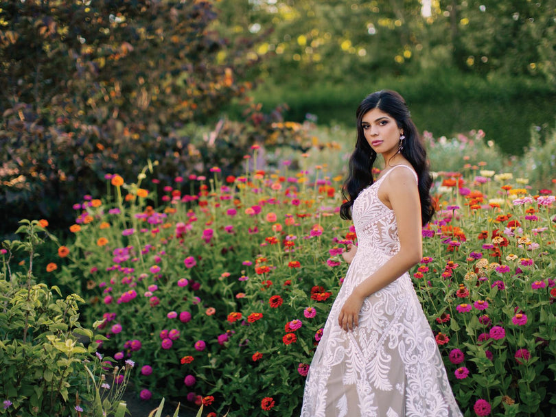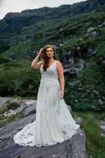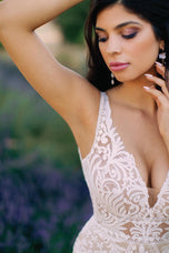 With a boho-inspired lace pattern for the destination wedding of your dreams, this a-line bridal gown is Millie, featured in Allure Bridal's Wilderly collection for Spring 2022. Designed with your beach wedding in mind, we're loving the woodsy, delicate fern fronds softly unfurling across the English net overlay. A flattering fit for any body type, you'll love the empire waist bodice and soft a-line skirt. We're loving the demurely sexy illusion bodice but are happy to offer a lined version for a more modest look (F249L). Please call our Dallas, Texas location to check in-store availability, pricing and current ship dates.