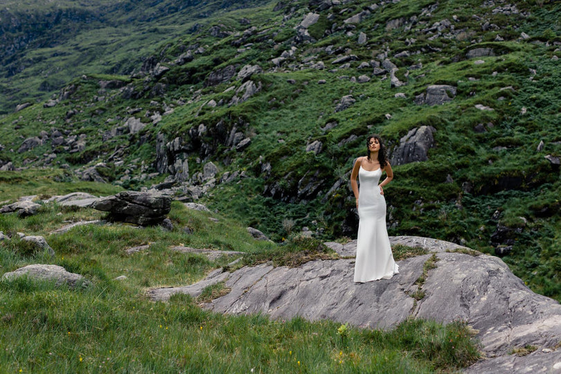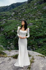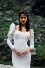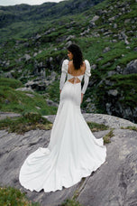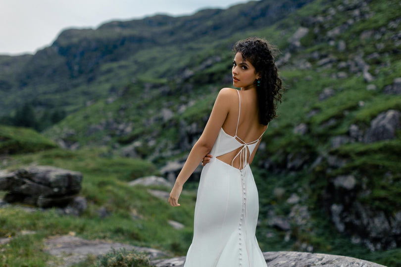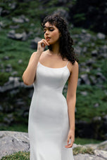 The Wilderly by Allure Bridals Spring 2023 Kacey crepe sheath is a beautiful and unforgetable dress for the destination bride. Its delicate straps and simple, clean chic look make it perfect for an informal wedding. With a strappy keyhole back, this dress is sure to make a statement whether your wed on a mountainside or outdoors under the stars. Please call our Dallas, Texas location to check in store availability, pricing, and current ship dates.