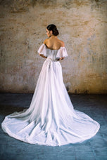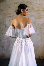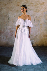 Designed for the Fall 2023 Wilderly Bridal gown collection and inspired by boho-brides and ethereal vibes, this is Lana. Lana is all things vintage glamour, with Swiss dot tulle frothing along the off-shoulder neckline. Her fun and flirty vibes would be perfect for your destination wedding or romantic outdoor ceremony. Finished with a strapless, off the shoulder neckline. Please call our Dallas, Texas location to check in store availability, pricing, and current ship dates.