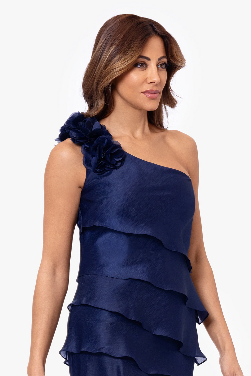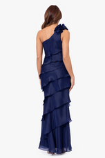 This captivating one-shoulder gown showcases cascading, layered ruffles that create a flowing and graceful silhouette. Enhanced by a floral accent at the shoulder, this dress embodies effortless elegance and feminine charm. Perfect for evening events, it offers a unique, structured look that moves beautifully with each step. This dress is a final sale. No Returns or Exchanges.